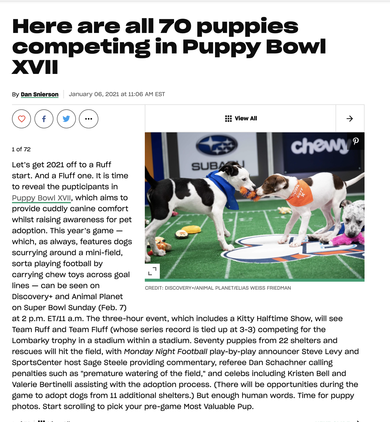 Three puppies are about to become world-famous in Animal Planet’s Puppy Bowl XVII. Be there virtually to party with us, and support animal rescue! #PupRally2021